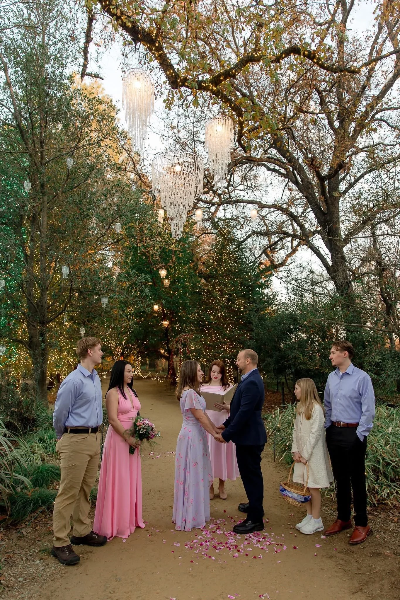 Towering trees create a stunning natural canopy, while warm, glowing lights weave through the branches to cast a romantic, golden ambiance. Sparkling chandeliers suspended overhead add a touch of timeless luxury, blending sophistication with the beauty of the outdoors. It’s a truly unforgettable setting designed to captivate your guests and bring your dream wedding to life.