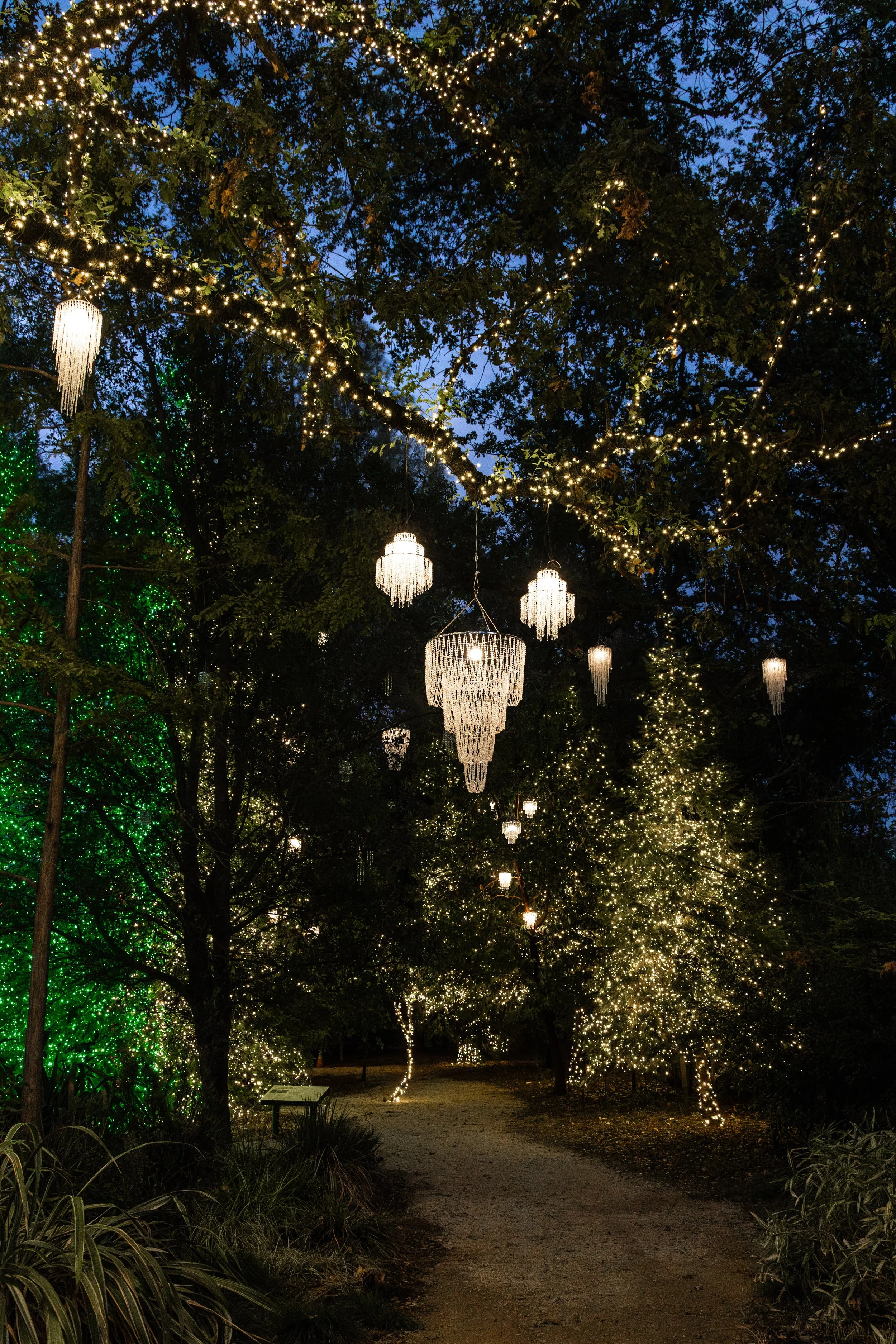 Our enchanted forest, nestled within the botanical gardens, offers a romantic setting under glowing lights and chandeliers.